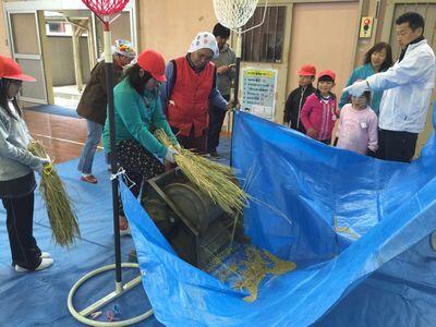 地域のMさんの指導の下、天日干ししておいた餅米の脱穀を行いました。最初に稲の束を脱穀機にかけて、次に唐箕にかけました。次は餅つきです。