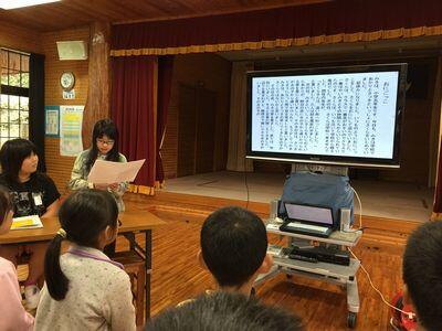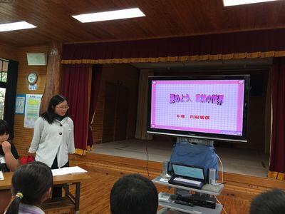 5年生と6年生が国語で学習したことについて発表しました。5年生は「物語つくり」を6年生は「言葉の意味について」を発表しました。最初に学習したことを説明して、発表しました。さすが、高学年という発表でした。
