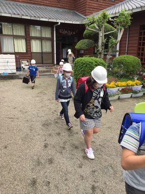 御池小学校は霧島連山(双子岩)の裾野にある学校です。学校の裏では4年前の新燃岳の噴火で積もった火山灰が被害を及ぼさないように、砂防ダムの工事が行われています。そんな中に位置する学校ですので、土石流に対する避難訓練はとても大切です。みんな真剣に取り組みました。