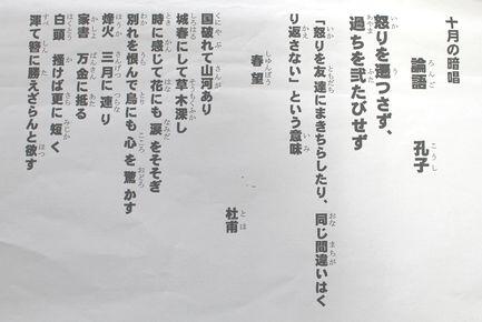 10月の音読は論語と杜甫の春望です。全員で元気な声をだして読んでいます。