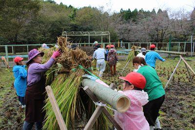 御池小学校の最後の稲刈りが行われました。(今年度をもって休校のため)始まる前は小雨が降っていましたが、稲刈りが始まる頃には雨が上がり、みんなで最後の稲刈りを行うことができました。この日は、給食試食会も行われ、試食会後に、これまで御池小学校のために支援をしてくださった学校運営協議会や稲作指導の地域の方々への感謝の会を行いました。