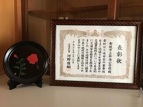 これまでの本校の交通安全への取組に対して、宮崎県庁において県知事表彰を受けました。県内で2校ということで、大変名誉なことでした。