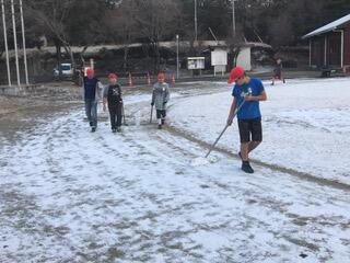 昨日からの寒波で運動場はうっすらと雪景色、寒い寒い朝でした。そんな中、御池小の児童7名は朝の運動と運動場のトンボ掛けをがんばりました。