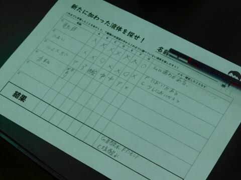 これまで学習してきた水溶液に、新しい水溶液を1つ追加して、その水溶液はどれかを探し当てる学習です。これまで学習してきたことを生かして、自分たちで必要な実験を考え、結果を整理して答えを導き出します。意欲的に学習に取り組む6年生です。