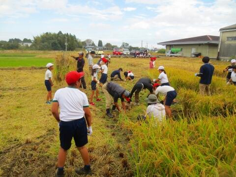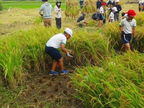黄金色の田んぼの中に、次々に入っていく5年生。鎌の使い方を教えてもらい、いざ稲刈り。最初は悪戦苦闘していた子どもたちでしたが、鎌の扱いに慣れてくると、どんどんペースアップ。稲の縛り方なども教えていただき、時間内に稲を刈り終えることができました。