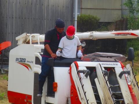隣の田んぼでは、全員がコンバインに乗せてもらう体験をしました。「機械の上から見る景色は最高だった」と感想を教えてもらいました。
