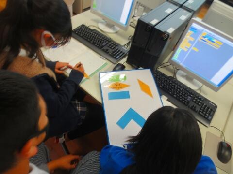 L字型の図形の面積を、分けたり、継ぎ足したりして長方形や正方形の面積を求める公式が使える形にしてから計算して求めるという授業でした。