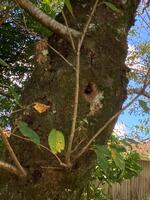 放課後児童クラブの子どもたちが見つけたハチの巣の入り口。指導員の先生へ伝え、ハチの出入りがみられることから、木の幹の中に、ハチの巣があることが分かりました。