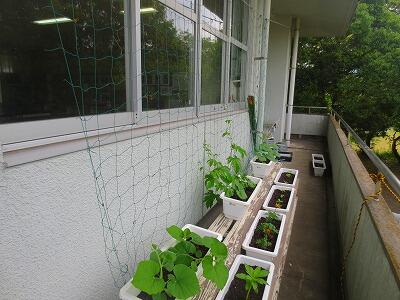 理科の学習でゴーヤ、ヘチマ、ヒョウタンを育てています。理科室のベランダで、グリーンカーテンになるように育てています。どんどんツルが伸びてきており、今のところ順調に育っています。