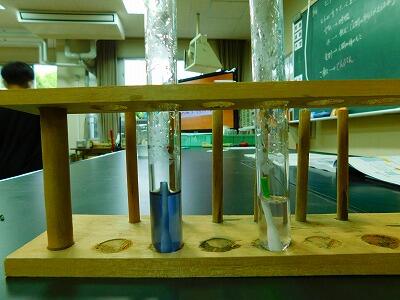 「水上置換法」という水の中で気体を集める方法を学び、いざ実験!窒素と二酸化炭素では、ろうそくの火はすぐに消えてしまいました。炎があまりにも早く消えてしまったため、実験が失敗したと勘違いする子もいました。