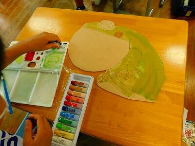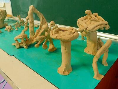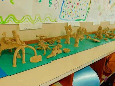 3年生の教室をのぞいて見ると、棚の上に粘土で作った素敵な作品がずらりと並べてありました。「僕のも撮って!」と自分の作品について説明してくれる3年生。どの作品もがんばりが伝わる作品でした。