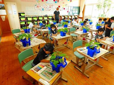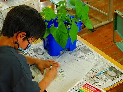 1年生は生活科の学習でアサガオを育てています。今日は、自分のアサガオを観察しました。形、色、模様など、細かく見ながらスケッチしていました。