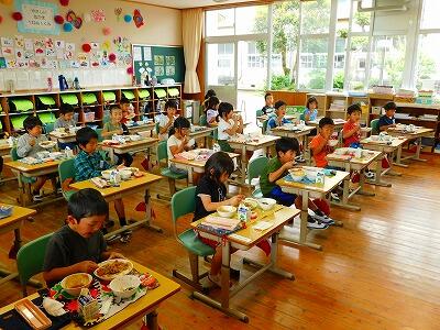 1年生の教室をのぞいて見ると、姿勢良く、もりもりと食べていました。