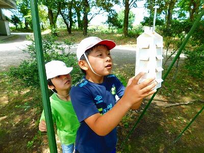 牛乳パックで作った百葉箱の中の温度計を注意深く観察する4年生です。