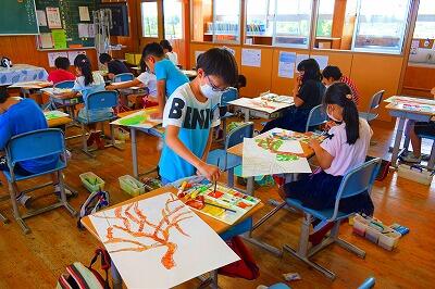 図工の学習で「木」を描いています。梅北小学校には、ケヤキ、センダン、イチョウなどたくさんの木があります。近くまで寄って観察したり、実際に触ってみたりして、丁寧に描いています。色塗りもこの時期らしいさわやかな色使いで塗っており、完成が楽しみです。