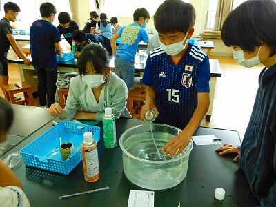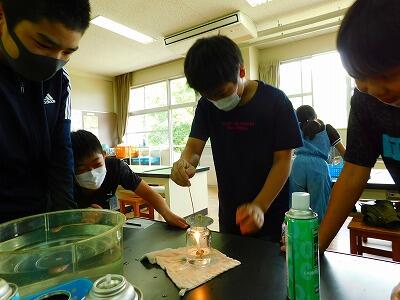 「水上置換法」という水の中で気体を集める方法を学び、いざ実験!窒素と二酸化炭素では、ろうそくの火はすぐに消えてしまいました。炎があまりにも早く消えてしまったため、実験が失敗したと勘違いする子もいました。