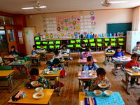 16日(水)は、一年生にとって初めての給食でした。メニューは、白ご飯、麻婆豆腐、もやしのナムル、牛乳。みんな「おいしい~!」と言ってもぐもぐ食べていました。片付けまで上手にできました。