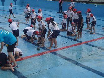 その後、プールサイドで、心臓に遠いところから水につかっていくことを学び、頭をぶつけないように気をつけながらプールに入りました。