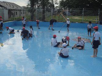各学年のプール開きが始まりました。今年度最初にプール開きをしたのは4年生でした。