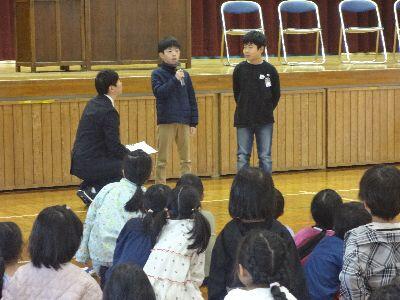 その後は、読書感想画・県文集「ともだち」に入賞した人や相撲やコンテストで入賞した友達を紹介しました。