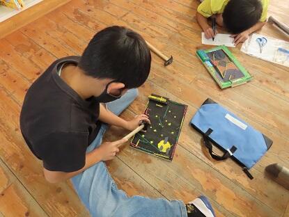 3年教室から、釘打ちの音や二賑やかな声が聞こえてきたので、のぞいてみると、図工の学習をしていました。