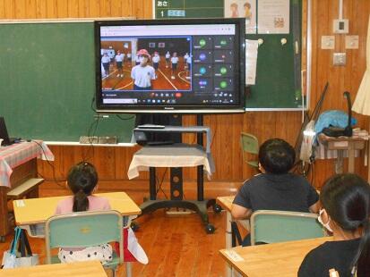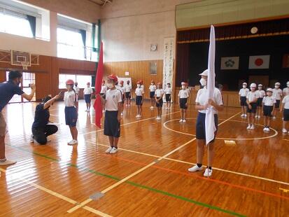 今回は、初の試みとしてリモート形式で行いました。体育館でのリーダーの様子を、リーダー以外の児童は、教室で見守ります。
