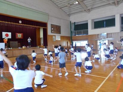 スモールステップで動きがだんだん増えてきます。かなりの運動量です。指導者の方の巧みな話と見事な実演もあって、子供達もノリノリです。