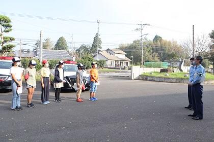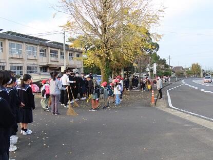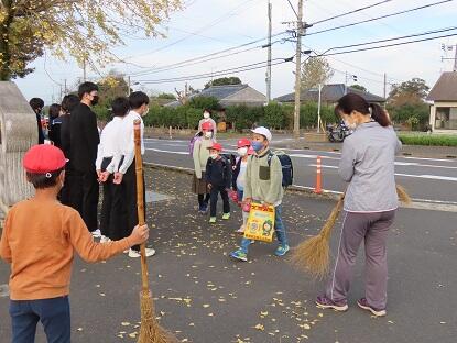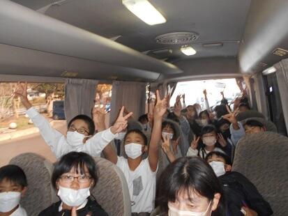 そして、上長飯霊地公演に出発です。6年生と1年生が手をつなぐ姿が微笑ましいですね。