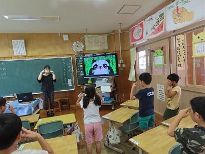 テレビの画面を見ながら、ALTや担任の先生と一緒に、歌ったり踊ったりして楽しみました。