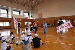 県内外で活躍されている宮田若奈さん率いる「宮崎花ふぶき一座」と中郷商工会青年部の方々が、12月16日に安久小学校に来てくださいました。「中郷地区を笑顔と元気に」プロジェクトの一環で、太鼓やサキソフォーンで、子供たちの好きな紅蓮華などの曲を演奏してくださいました。