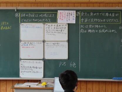 地域による日本の気候の違いを学習していましたが、資料からの気付いたことを、班でまとめてホワイトボードに書いていました。