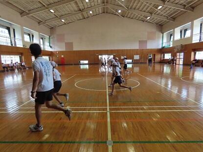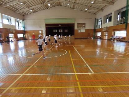 体育館を覗いてみると、6年生が体力テストのシャトルランをしていました。シャトルランは、時間内に一定の距離を往復する回数を図る持久力の測定法です。