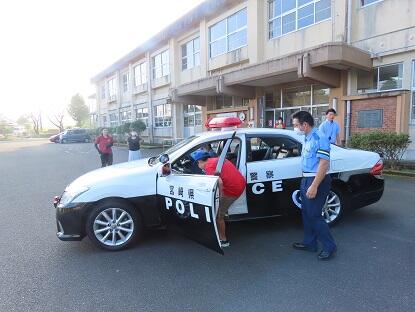 警察の方が来られ、交通安全の広報の一環として、小学生をパトカーに乗せて呼びかけを行う交通少年パトカー広報がありました。