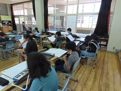 音楽室から賑やかな音が聞こえてきたので、のぞいてみると、6年生が合奏の練習をしていました。