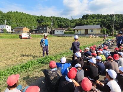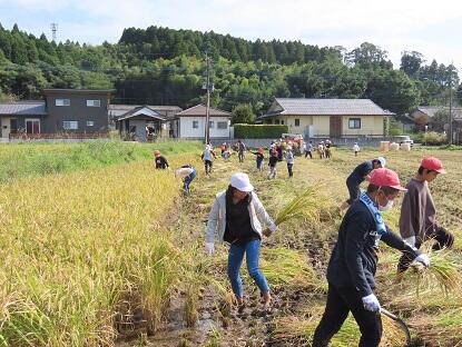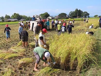 キンモクセイが香るようになった秋空の下、5年生が稲刈りをしました。