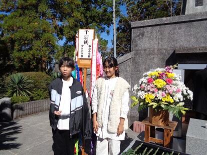 本校からは、5・6年生が共同で作成した千羽鶴を献納しました。