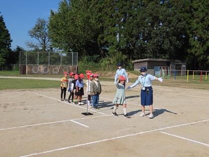 その後、運動場に準備した横断歩道を使って、実際に安全な横断の指導を受けました。とにかく大切なのは、「落ち着いて確認」ですね。