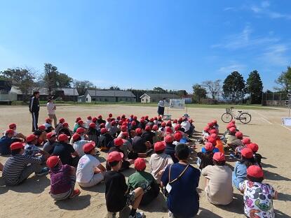 まず、自転車の点検の仕方、横断歩道での横断の仕方、飛び出しや巻き込み事故の怖さについて、全体で話がありました。