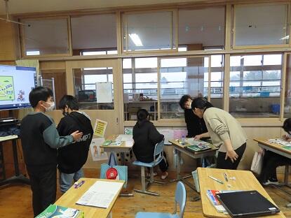 また、離れたところでは、互いに教え合っている児童がいました。