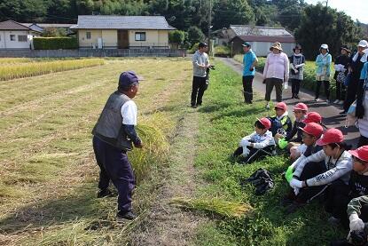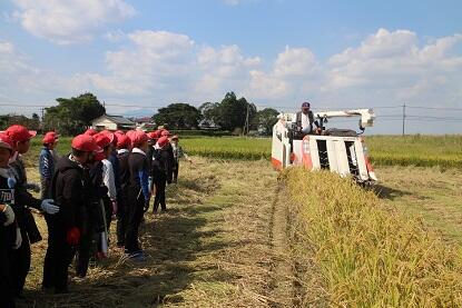 そして、今回もコンバインによる稲刈りの様子も見学しました。機械による効率化を実際に見ることで、生産性を上げるための工夫について学びました。