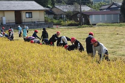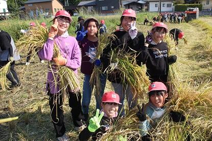 鮮やかな黄金色で頭を垂れる稲を、子ども達はどんどん刈り進んでいきました。