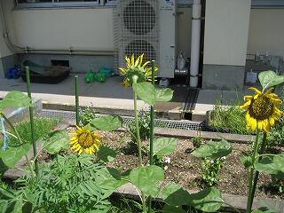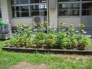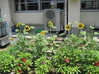 4年生の花壇にひまわりが植えられています。太陽の光をいっぱいあびてぐんぐん大きくなっています。「向日葵(ひまわり)」と漢字で書くだけあって、みんなお日様の方向を向いて咲いています・・・。