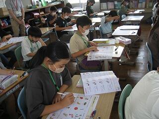 5年生の外国語活動の時間の一コマです。写真ではわかりづらいのですが、モニターから流れる英語を聞いて問題を解くヒアリングのテストを行っています。子どもたちは、耳から外国語に馴染んでいくのですね。