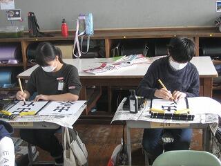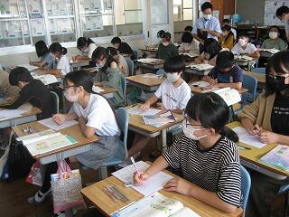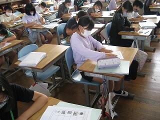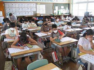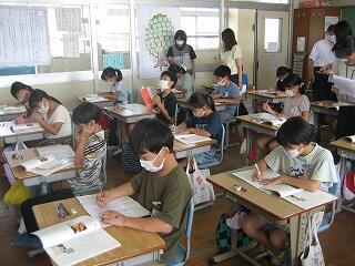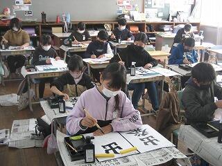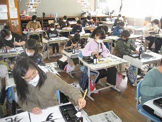 5年生の習字の時間の一コマです。しーんとした緊張感がただよう雰囲気の中で、みんな真剣に半紙に向かっていました。美しい姿勢できれいな字が書けていますね。