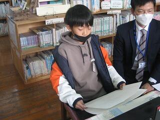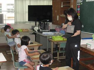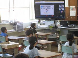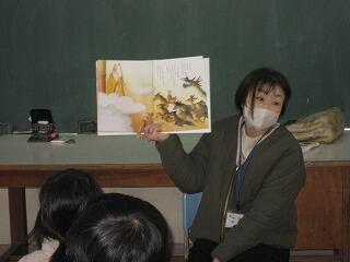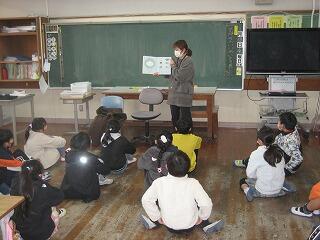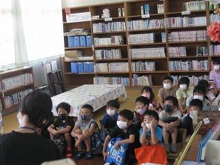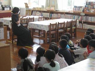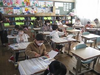 図書の時間に図書館サポーターの先生が絵本の読み聞かせをしてくださいました。子どもたちはくいいるように絵本を見ていました。読書好きの子どもが増えるといいですね。