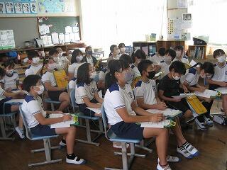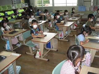 本日、1学期の終業式をオンラインで行いました。まず3名の児童代表が1学期の反省や2学期に向けての目標をしっかりと発表してくれました。その後、先生方から夏休み中の安全や健康についてのお話をしました。