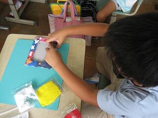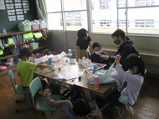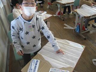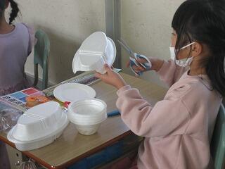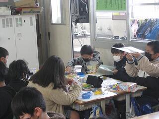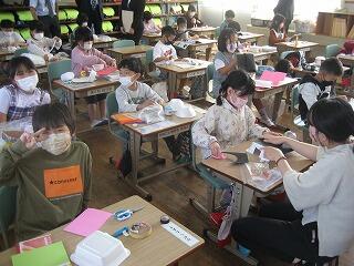 1年生は図工の時間に発泡スチロールの容器を使って風で動くおもちゃを作る「ふわふわゴー」という学習を行いました。みんな工夫を凝らしたおもしろい形のおもちゃができていましたよ。動かすのが楽しみですね。