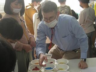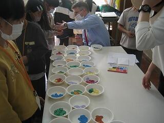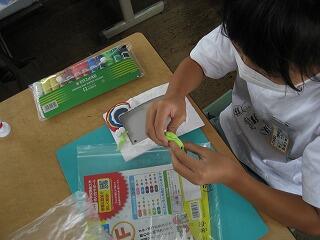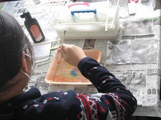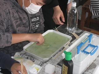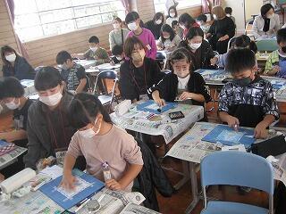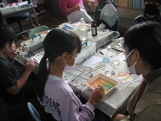 5年生のふるさと学習は「マーブリング」。講師の先生に教えてもらっていろんな色をきれいに液体に溶かしていきます。自然な重なりや模様ができ、とてもきれいな作品になりました。