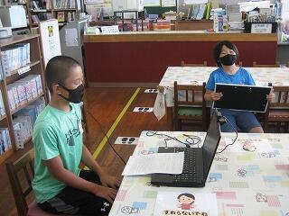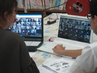 2年生の授業の一コマです。教室でみんなが授業を受けていますが、パソコンの画面の向こう側にもお友達がいます。家で勉強してくれているお友達とオンラインで授業をつないでいます。「離れていても一緒に学習」しています。