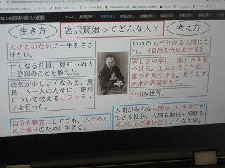 6年生のクラスで国語の研究授業を行いました。題材は宮沢賢治の「やまなし」。難解な内容ですが児童は宮沢賢治の生涯と照らし合わせてこの作品の深さを感じていたようでした。
